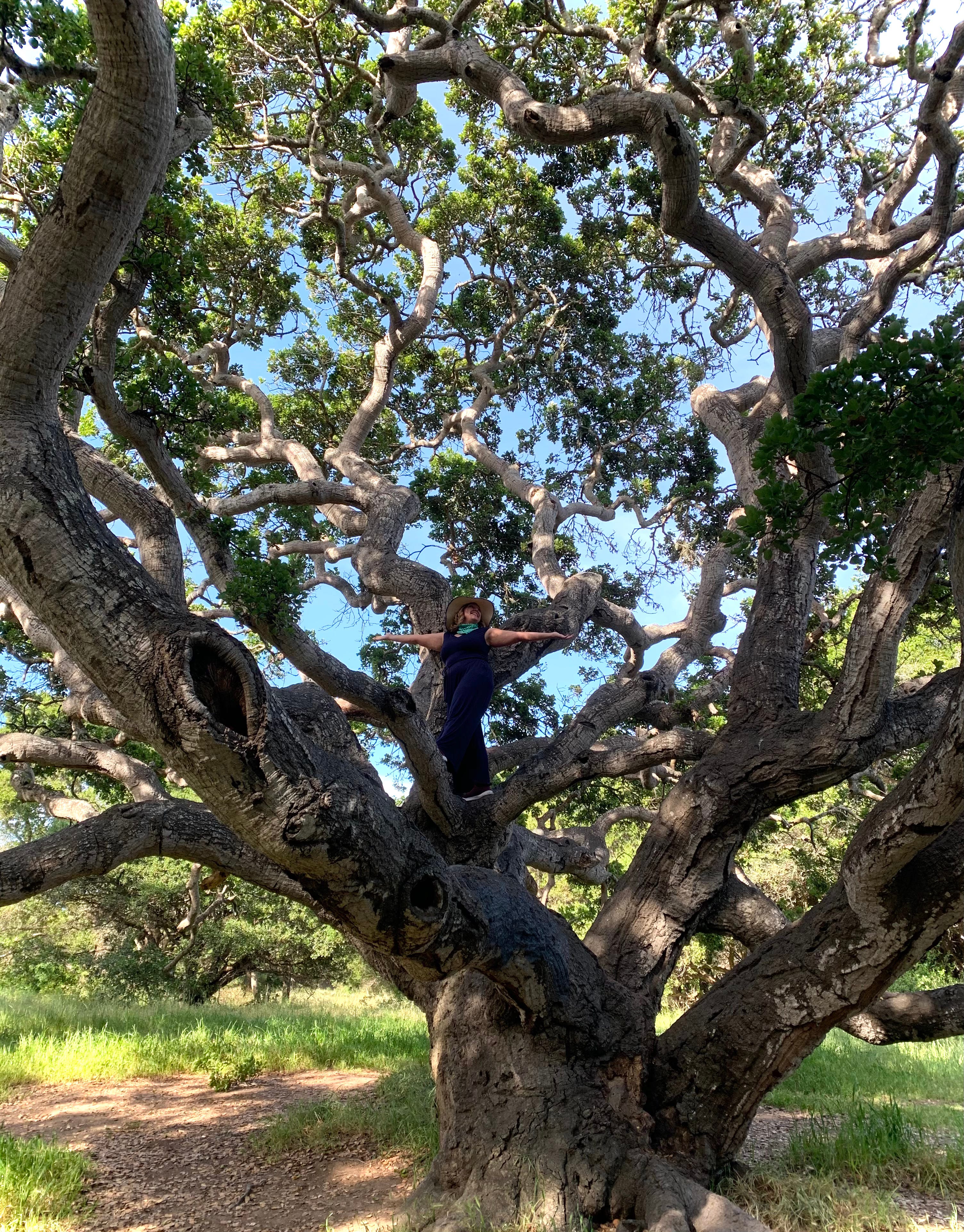 There is an oak tree that I visit when I want to feel held. She is old enough and large enough that I can climb up into her twisting branches and rest my back against one, my legs stretched out across an equally thick companion branch, and just rest. In the year I did my EcoMinistry program I visited her weekly for guidance. She became my grandmother. In her arms, 7 feet above the ground, I found I could also be in relationship with the sky in a way I never had before. I could reach a hand into its vastness. Wrapped in the steady presence of Grandmother Oak, I was able to be lifted to the sky and know its shifting moods and offerings.